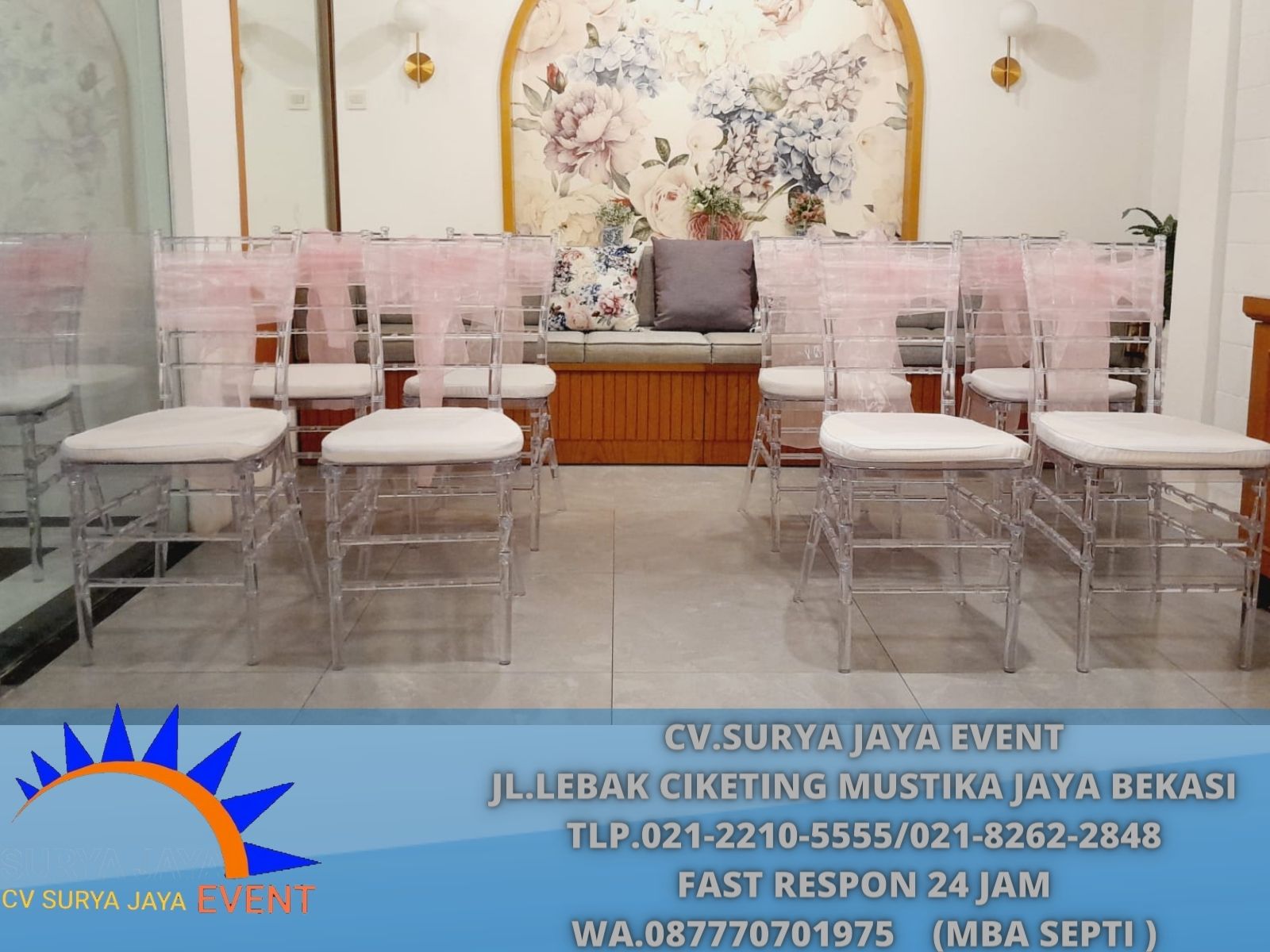 Penyewaan Kursi Tiffany Acryllic. Kami menyewakan berbagai kebutuhan pesta lengkap. Salah satu produk yang kami sewakan ini sangat direkomendasikan untuk berbagai acara, seperti: pelaminan, lamaran, pesta, event, dinner, pertemuan, dan masih banyak lagi kegunaan lainnya. Setiap penyewaan, kursi dapat dilengkapi dengan pita, cover, dan sejenis dekorasi lainnya.