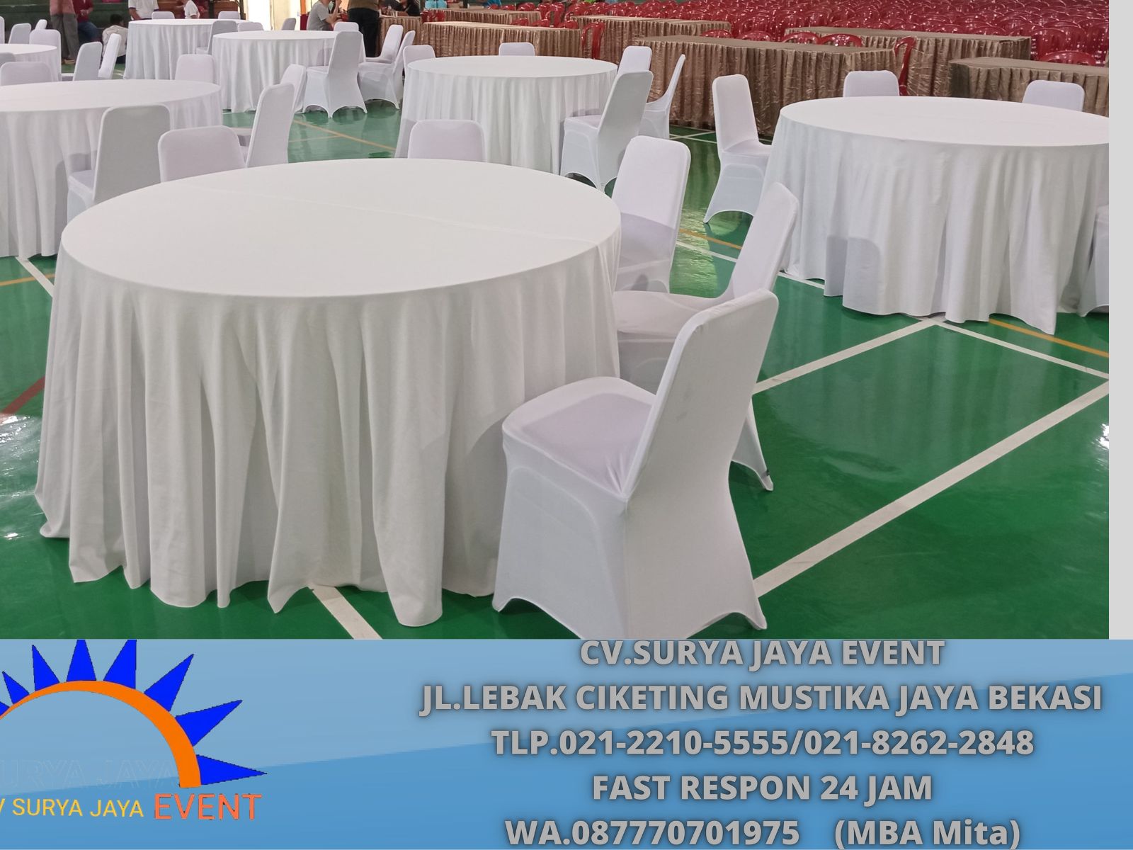 Sewa Round Table d160cm Dan Kursi Futura Cover Putih Parung Bogor. Yu, lengkapi kebutuhan acara anda dengan menggunakan produk dari jasa sewa CV.SURYA JAYA EVENT.