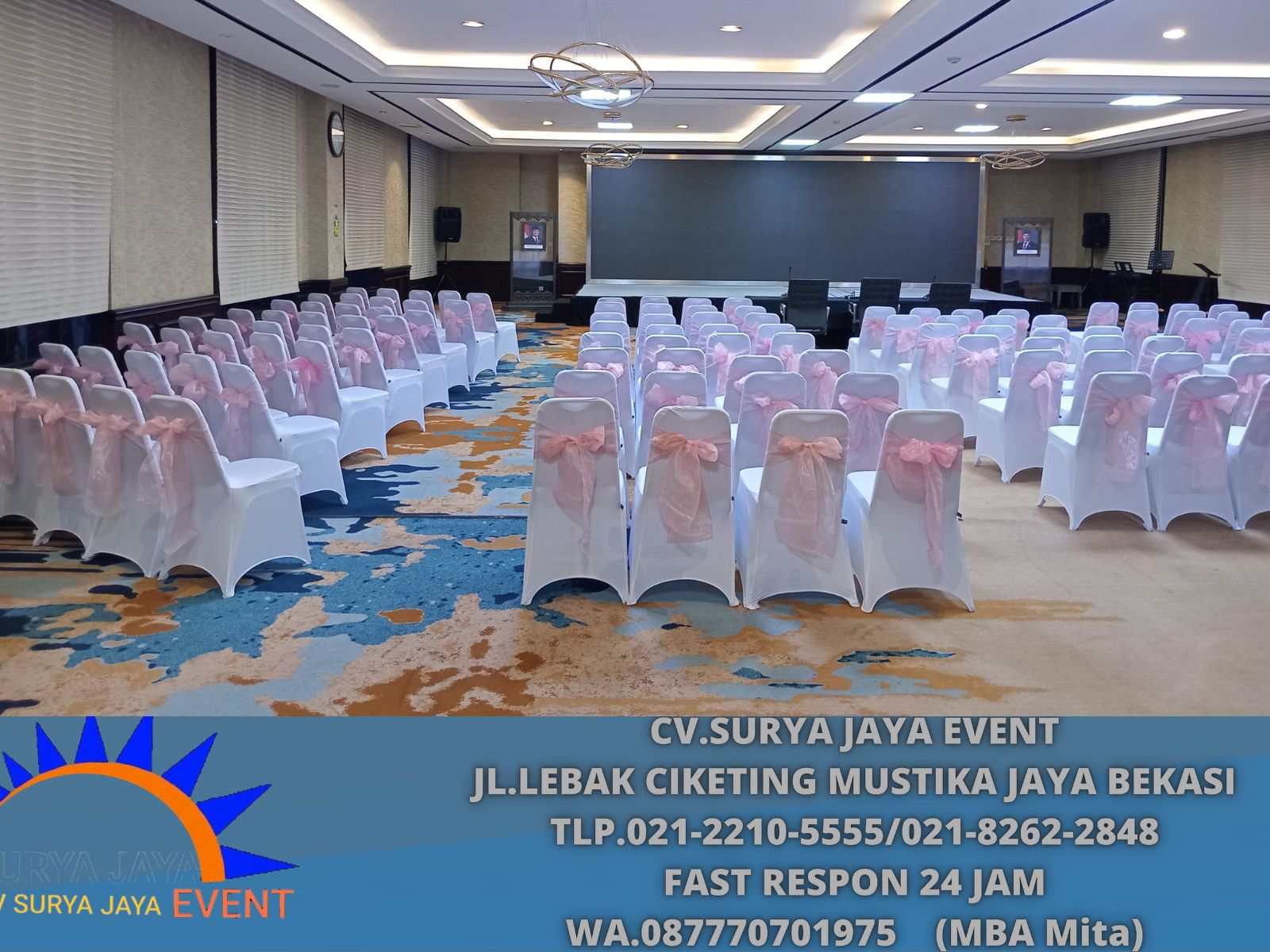 - Panggung, backdrop, tirai (hitam, putih), tiang antrian, tiang bendera, karpet, gubugan prasmanan, beanbag, minigarden, gong peresmian, dan lainnya.