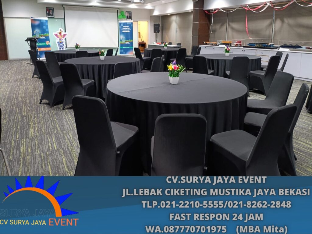 Rental Round Table Cover Hitam Dan Kursi Cover Hitam Jakarta. CV. SURYA JAYA EVENT ingin menawarkan anda yang akan mengadakan acara-acara, membutuhkan produk alat pesta dan mencari jasa yang aman juga amanah.